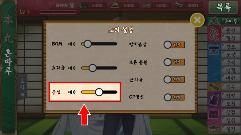 게임 내의 「목록(目録)」>「설정(設定)」>「소리 설정(音設定)」에서