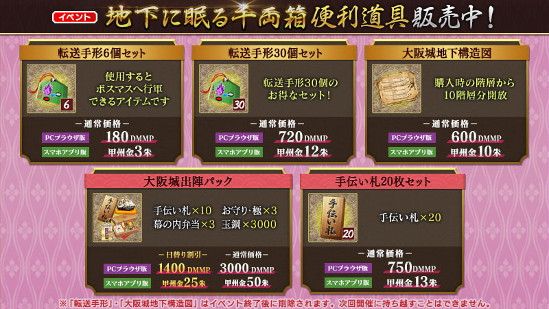 「지하에 잠든 천냥상자」는 오사카성 지하의 수수께끼의 공간을 탐색해 코반을 모으는 이벤트입니다.